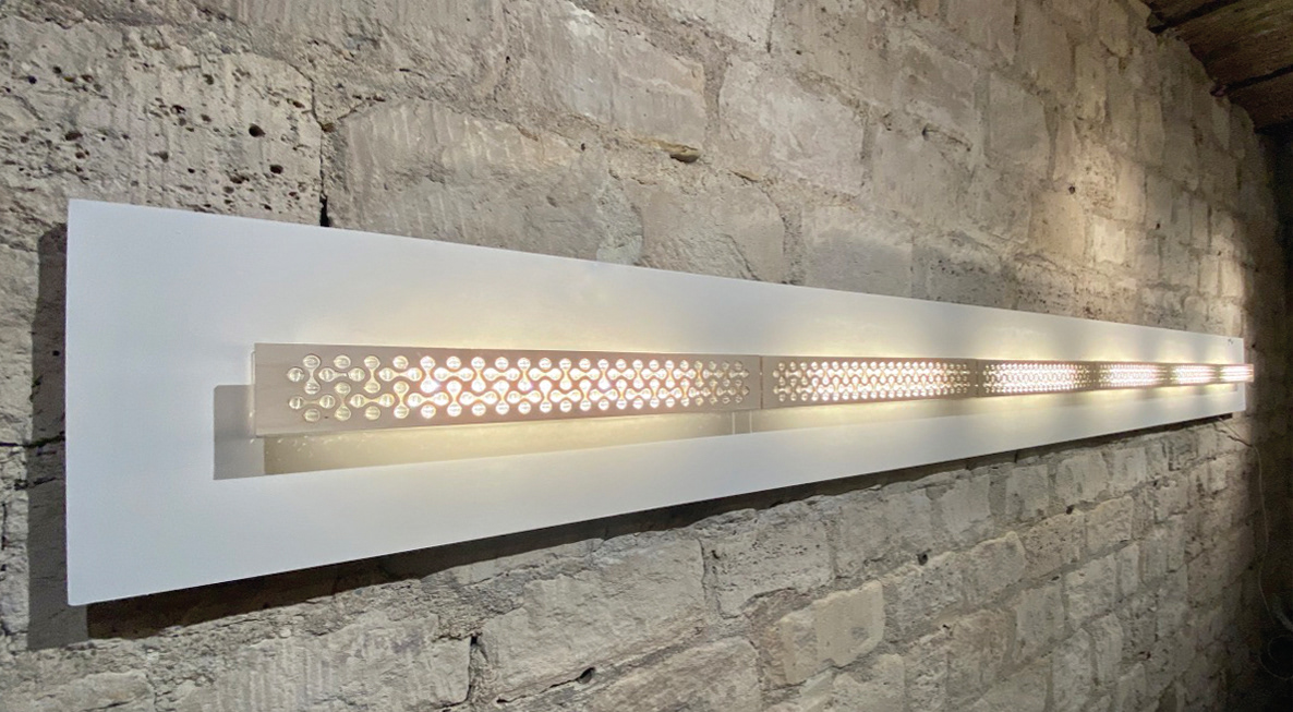 Rail d'appliques au motif évoquant l'organisation rectiligne, les grandes artères, les groupes de touristes en file indienne sur les trottoirs des Champs Elysées les réseaux routiers et les véhicules stop-feu éclairés sur le Boulevard Haussmann. Les pistes d’aéroport et les avions alignés en attente de décollage...